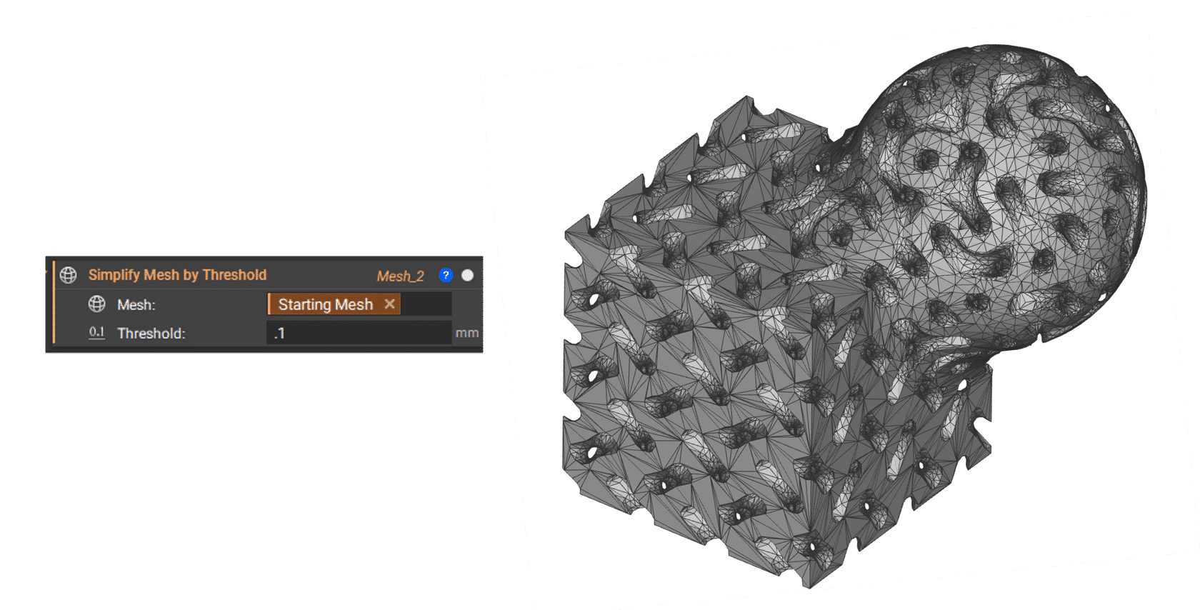 - Start with 10% of the input mesh tolerance and then decrease from there. (i.e. if your Mesh from Implicit Body tolerance is 0.1mm, your starting Simplify Threshold value is 0.01mm)