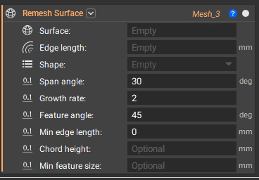 Useful in converting a surface mesh to a solid mesh. When doing this, ensure the Edge length is the same size for the Remesh Surface block and the Solid Mesh block to create tetrahedral elements.