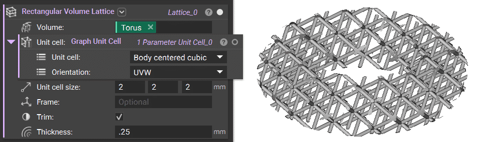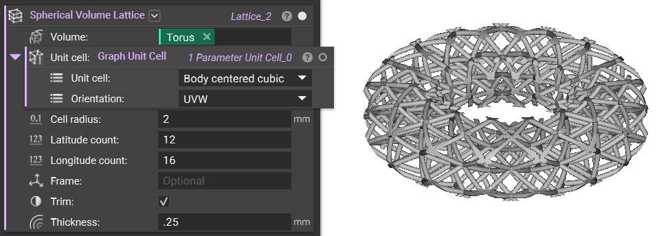 These blocks automatically create a Cell Map based on the implicit body used as the Volume input. You can use the Frame input to translate and orient the tessellation of the Unit Cells and check/uncheck the Trim option to trim the final lattice to the input Volume.