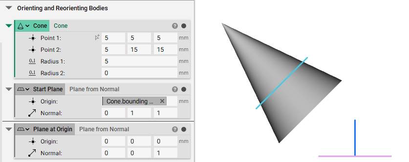 We will generate a Start Plane using Plane from Normal, which is defined from the centroid of this cone. We will also define the normal vector to capture the normal direction of the cone, in this case [0, 1, 1], and set an origin at the global origin to generate Plane at Origin.