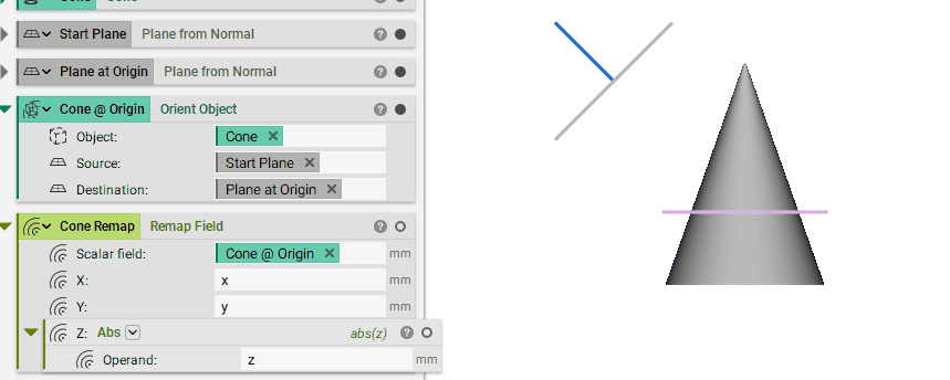 We will make the z axis the absolute value of z. This means the cone will flip across the Plane at Origin. The Remap Field block takes the value of the SDF in the positive z domain and remaps, so that the same positive value is true in the negative domain of Plane at Origin.