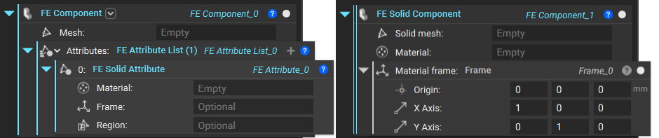 You can use either the FE Component block and fill out the Attribute as FE Solid Attribute or the built-in toolkit block FE Solid Component, which lets you skip the step of defining the attribute type.