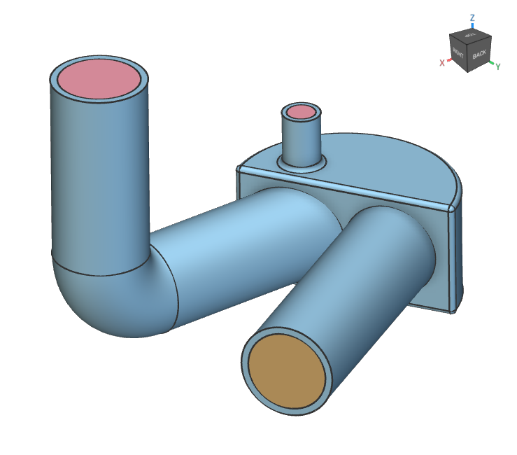 The (2) pink faces represent the inlets. At the larger inlet, define a fluid velocity 0, 0, -50000] mm/s. At the smaller inlet, assign a velocity of [0, 0, -6000] mm/s.