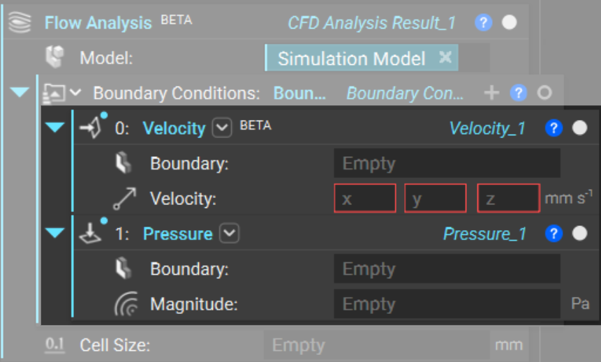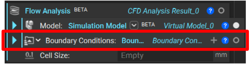 After defining our flow analysis Model, we assign conditions at our inlet and outlets using Boundary Conditions. The Flow Analysis block auto-generates an empty Boundary Condition List.