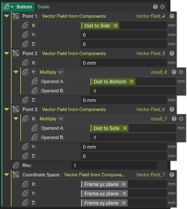 For Point 2, our X and Z will be zero, and our Y will be the distance to bottom field multiplied by -1. This will ensure that our surface falls underneath the XY plane in the negative Z direction. And for Point 3, we’ll use the mirrored version of our distance to side. So for our X, we’ll use a Multiply block with our distance to side and -1. We’ll again leave our Y and Z at zero. Our row can be any value between 0 and 1, so we’ll set it at 1 in this case. Finally, add a coordinate space for our X, Y, and Z. We’ll just pull planes from our frame variable that looks like this.
