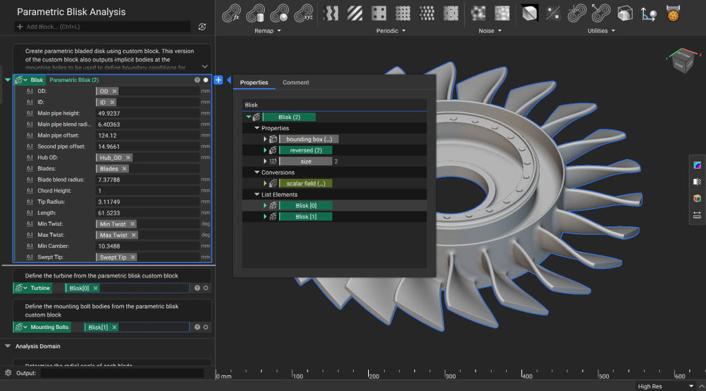 Generate the parametric blisk using the updated custom block. This custom block now outputs a list of implicit bodies – the first element is the blisk, the second element is a polar array of cylindrical bodies at the mounting holes.
