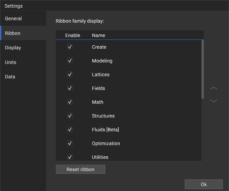 Here you can toggle which tabs of the ribbon are visible in the nTop instance by turning on/off the checkboxes.