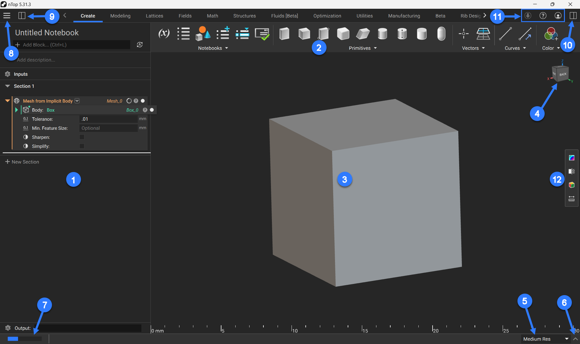 The ribbon contains blocks for performing different operations in nTop. You can navigate the ribbon by clicking on the tabs to change block menus. You can also use the arrows to reveal additional tabs.