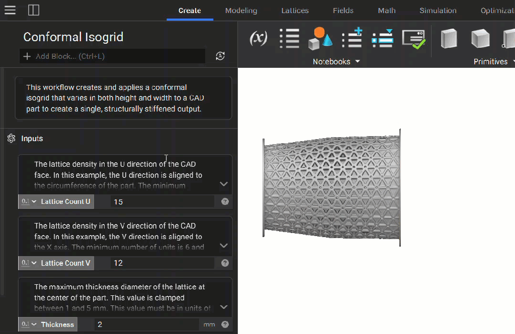Comparable to the model tree in traditional CAD software, the Notebook keeps a record of modeling operations. In nTop, you add a series of different Blocks to the Notebook to create a workflow, where each block serves one specific function. When given a set of inputs, a block computes an output that can also be used as input for other blocks.