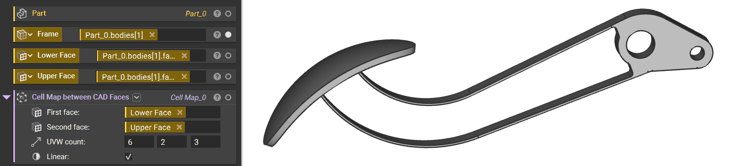 The Cell Map between CAD Faces block generates a Cell Map between two CAD faces. The UVW count input specifies the number of cells in the three coordinate directions.