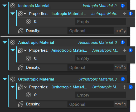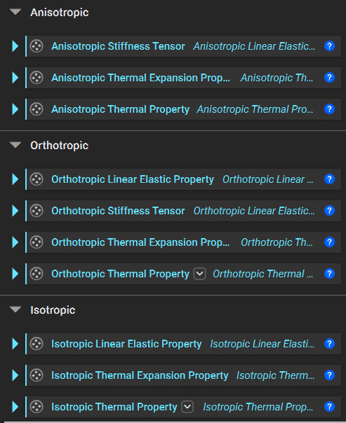 For isotropic and orthotropic material blocks, you can add a Linear Elastic Property. The anisotropic and orthotropic materials have Stiffness Tensor blocks. For all of these materials, you can add Coefficient of Thermal Expansion and Thermal Property blocks. Add the Property blocks to the Isotropic Material Property List. Use the ‘+’ to add more inputs to the list. All of these available blocks are shown in the image below.