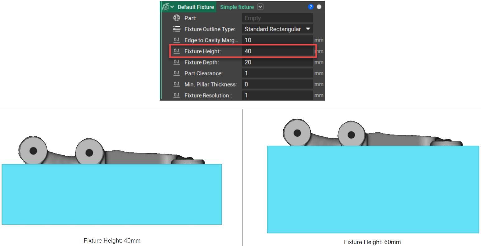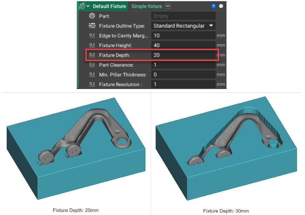 How deep the part sits in the fixture design space to create the jig. A larger fixture depth increases the depth of the resulting jig. Fixture depth should not exceed the total height of the input design.