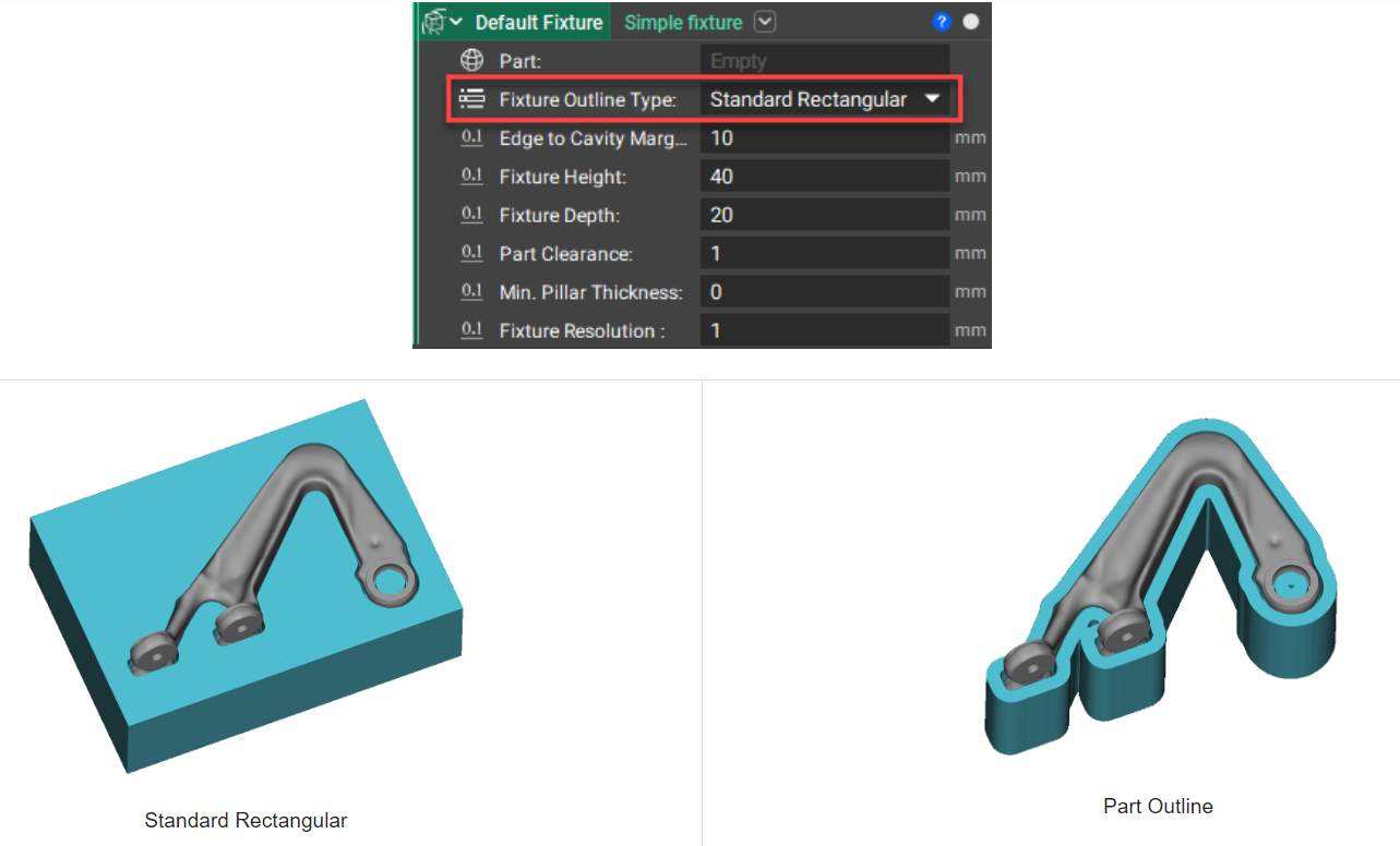 Choose between a rectangular outline or part outline shape to create the fixture design.