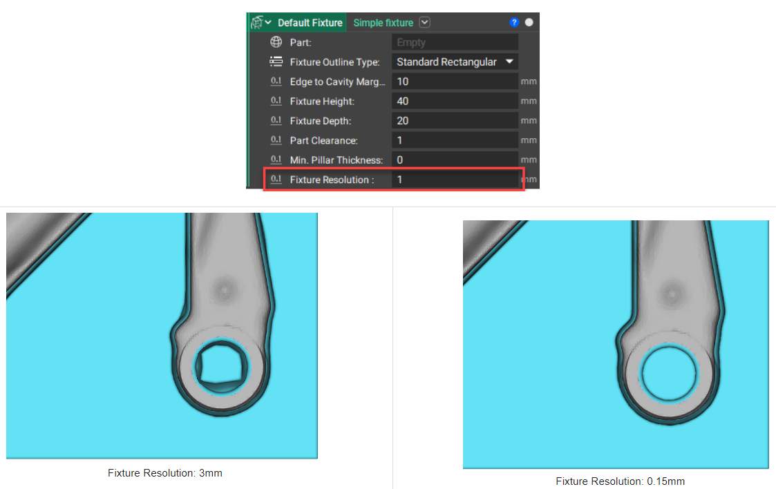 The level of detail you want to preserve in the cavity of the jig. A lower value increases the level of detail captured but is more computationally expensive. This value should be the minimum feature size of your part. The Cavity Detail should not exceed the clearance value of the part.
