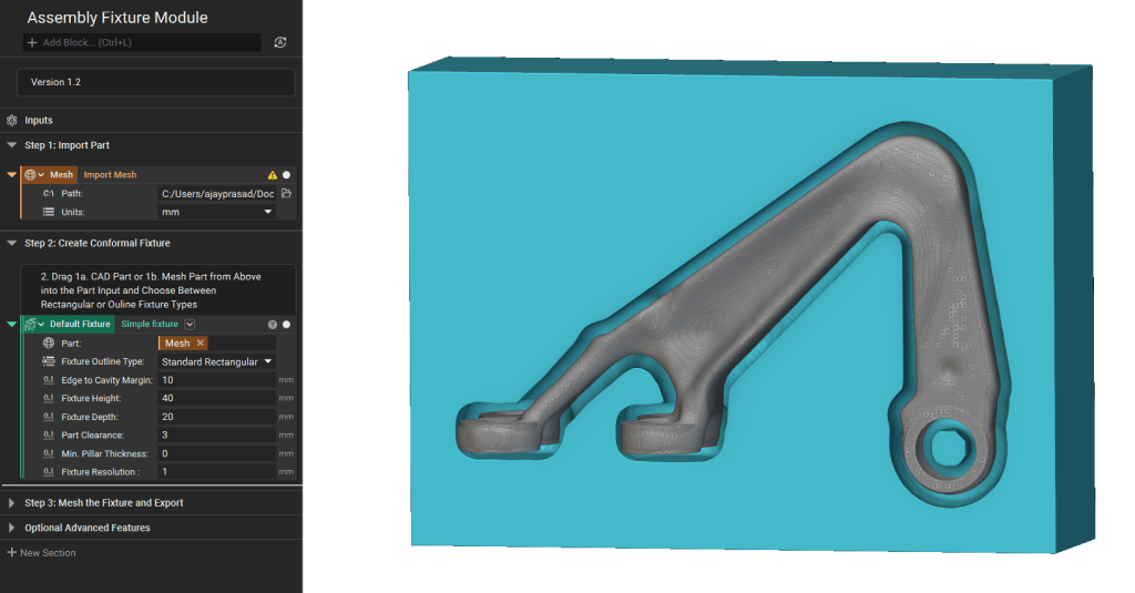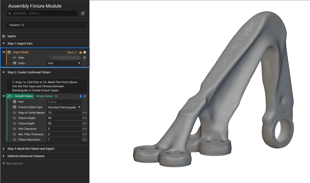 You start with the geometry for which you want to create a fixture. You can start with either a CAD or a Mesh, which can be imported using the Import Part or Import Mesh block.