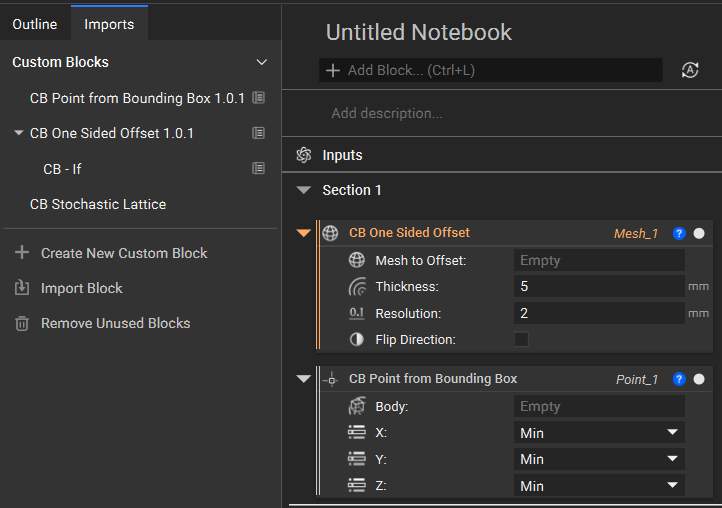 When imported, the CB will appear as a single block in the body of the notebook. If you change the nTop file containing the unpacked CB, you’ll need to re-import the CB to see the changes take effect.