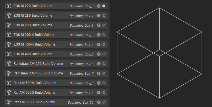 To help define where your parts will be located on the printer, you can use our selection of build volumes or create your own. Each of these build volumes is bounding boxes with the dimensions for those printers predefined. To define your build volume, you can input the dimensions in a Bounding Box block. If you use this often, you can create a custom block of this bounding box and save it in your My Blocks folder. Check out our 230: Intro to Automation course for more information on that process.