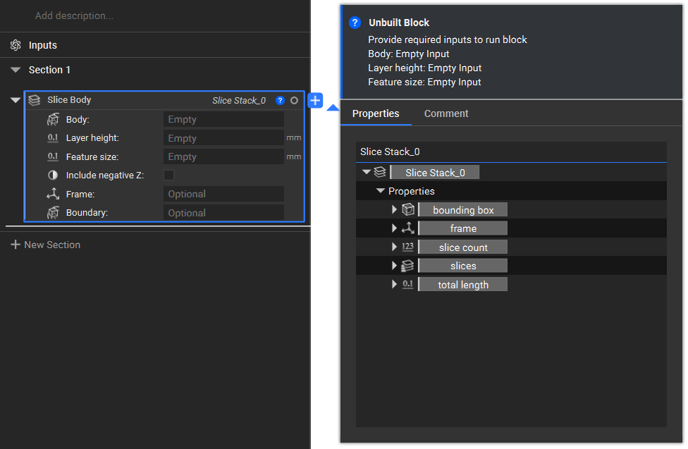 Each slice stack has the properties of slice count (how many slices are produced), slices, and total length. You can also find the cross-sectional area and the total length property within the slices options.