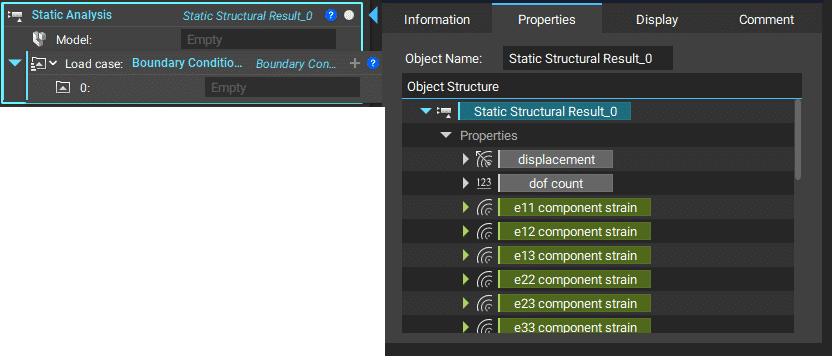 The key properties specific to the structural analysis block include many scalar fields containing information such as the part’s Von Mises Stress, Displacement, etc. We will not use these properties in this course, but they can be used to drive parameters such as beam thickness, which you can learn in our 320: Data Driven Design course.