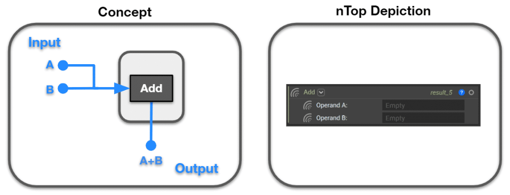 Depending on its type, a block’s output can be seen as a geometric representation on the screen or as a computed value at the top right of the block. The Add block shown above displays the output value of 2 due to adding Operand A and Operand B together.