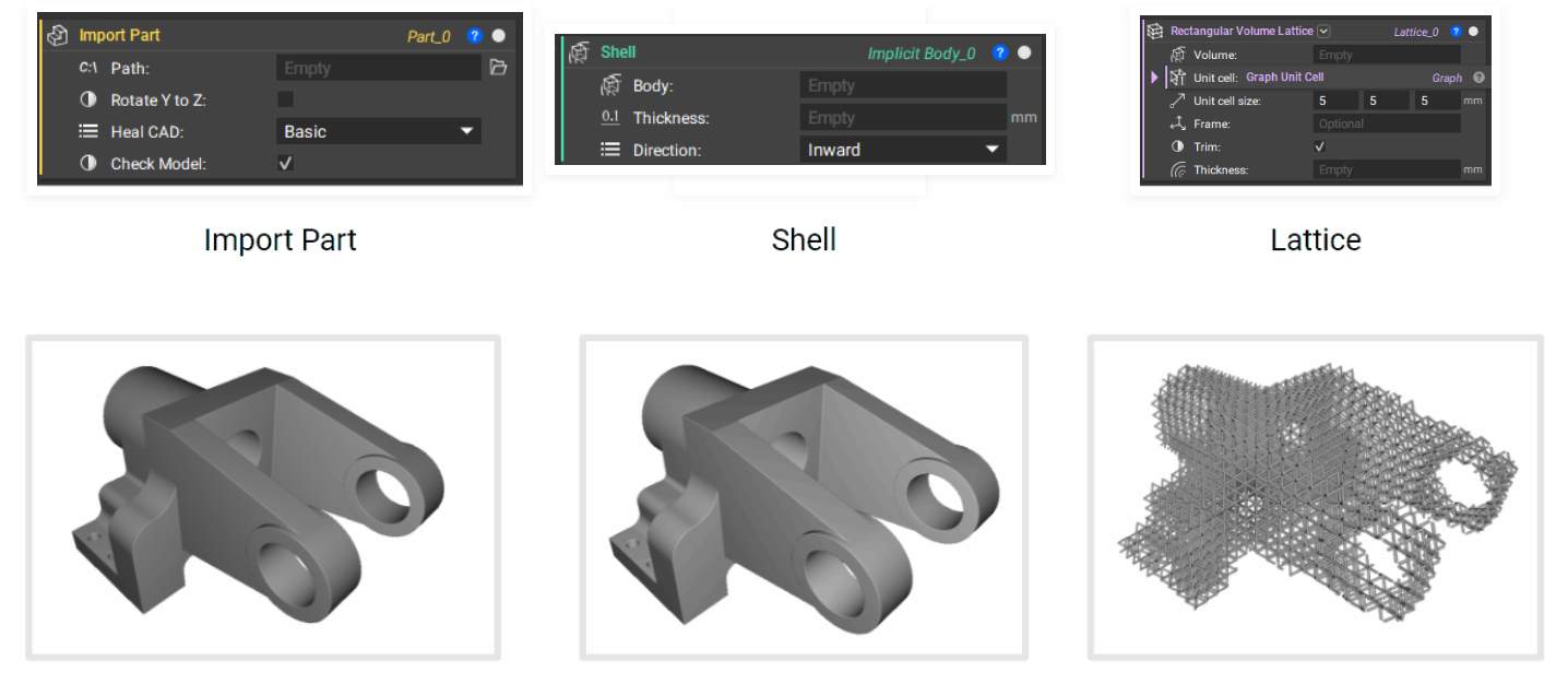 Comparable to the model tree in traditional CAD software, the Notebook keeps a record of modeling operations. Unlike in traditional CAD, however, all operations in nTop are not performed on the geometry itself. Since the geometry on the screen is only a representation of the mathematical equations behind the scene, it is our choice of inputs or parameters within the Notebook that creates and manipulates the geometry. In a sense, users can think of nTop as a visual programming language.